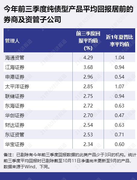 前三季度回报靠前的纯债型券商集合理财产品有“海通怡然恒旭1号”“太平洋玉溪抚仙1号”和“江海嘉盈1号”等。此类产品前三季度平均回报排名居前的券商及资管子公司有海通资管、江海证券、申港证券等,中泰证券资管、诚通证券、广发资管排名依然靠后。