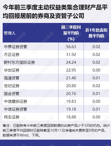 前三季度回报排前三的主动权益类集合理财产品为“中泰海博思创员工参与科创板战略配售”“国金吉贝尔高管参与科创板战略配售1号”和“中信证券资管星河48号”。此类产品前三季度平均回报排名居前的券商及资管子公司有中泰证券资管、方正证券、野村东方国际证券等。排名靠后的券商及资管子公司包括万联资管、大同证券、华龙证券等。
