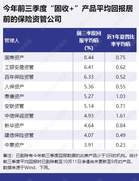 前三季度“固收+”产品平均回报排名靠后的保险资管公司则包括民生通惠、合众资产、华安资产等。