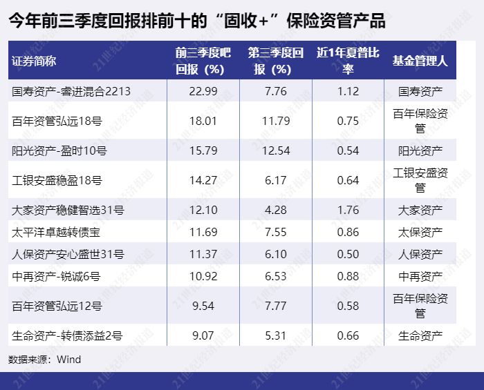前三季度回报靠前的“固收+”保险资管产品包括“国寿资产-睿进混合2213”“百年资管弘远18号”“阳光资产-盈时10号”等。此类产品前三季度平均回报排名居前的保险资管公司有国寿资产、工银安盛资管、百年保险资管等。排名靠后的保险资管公司则包括民生通惠、合众资产、华安资产等。