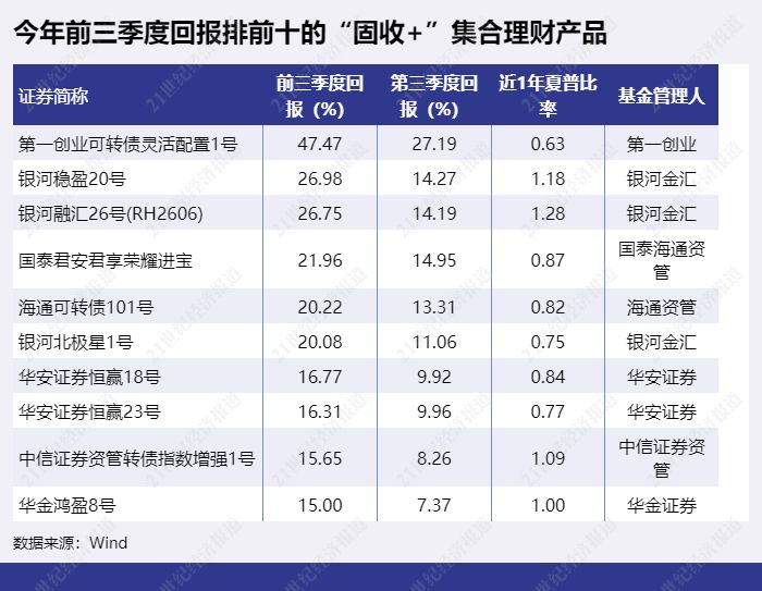 “固收+”集合理财产品通过“+”的部分投资分享权益类资产等其他类型资产上涨的收益,收益表现颇为亮眼。已有6只产品前三季度收益率超过20%。